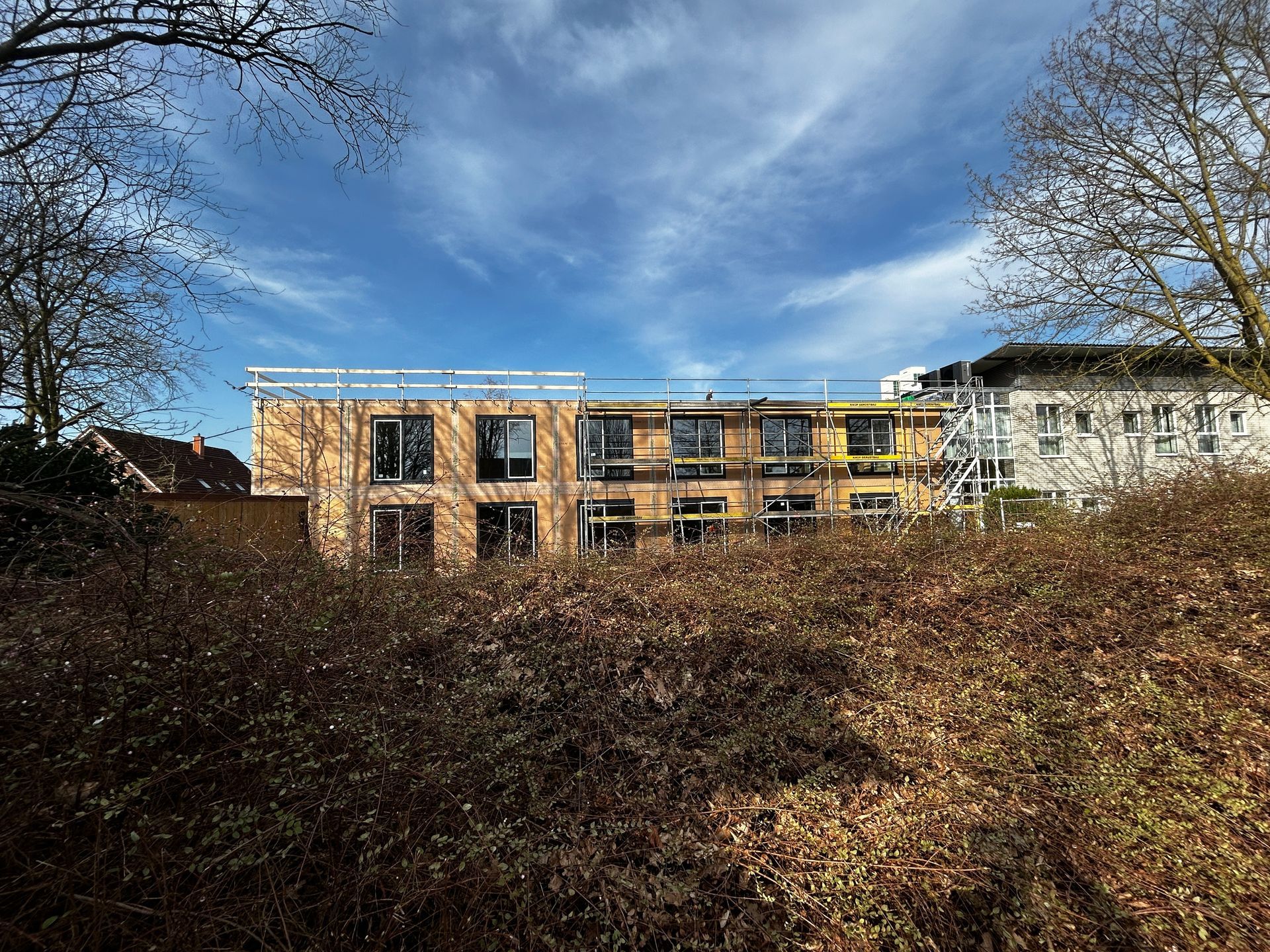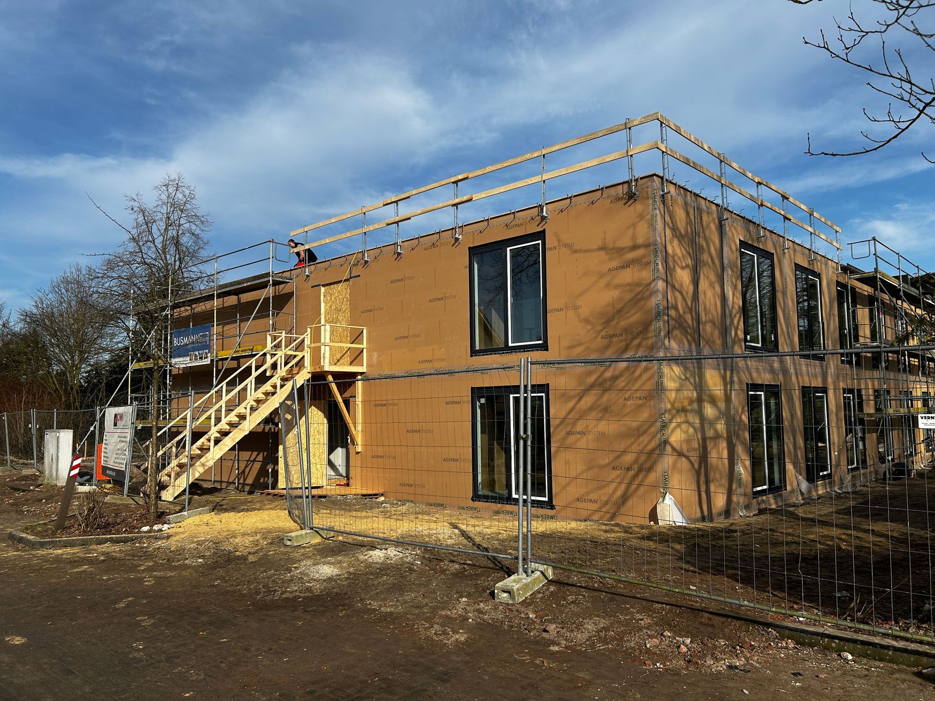 Das innovative und nachhaltige Konzept, mit in der Werkstatt vormontierten und fertig ausgestatteten Raummodulen aus Holz das neue Gebäude zu erstellen, wird augenblicklich von der Fa. Busmann Holzbau aus Schüttorf realisiert.