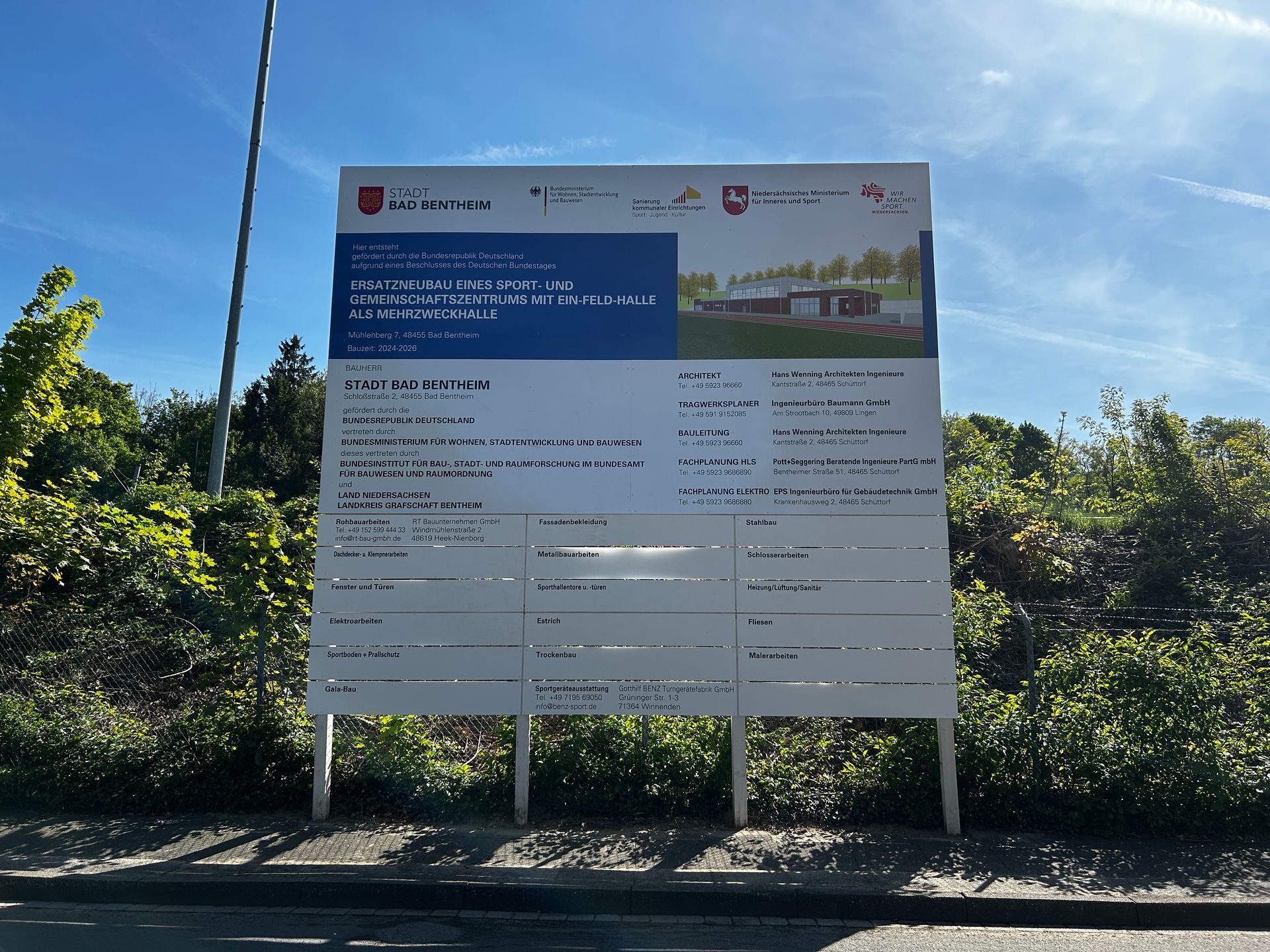 Am Mühlenbergstadion in Bad Bentheim, Ortsteil Gildehaus, entsteht eine neues Mehrzweckgebäude als Sport- und Versammlungsstätte, welches neben einer 15 x 27 Meter Halle für den Schul- und Vereinssport sowie für Veranstaltungen zusätzlich eine moderne 50 Meter Raumschießanlage und Raumbereiche für die Dorfgemeinschaft Gildehaus vorsieht.