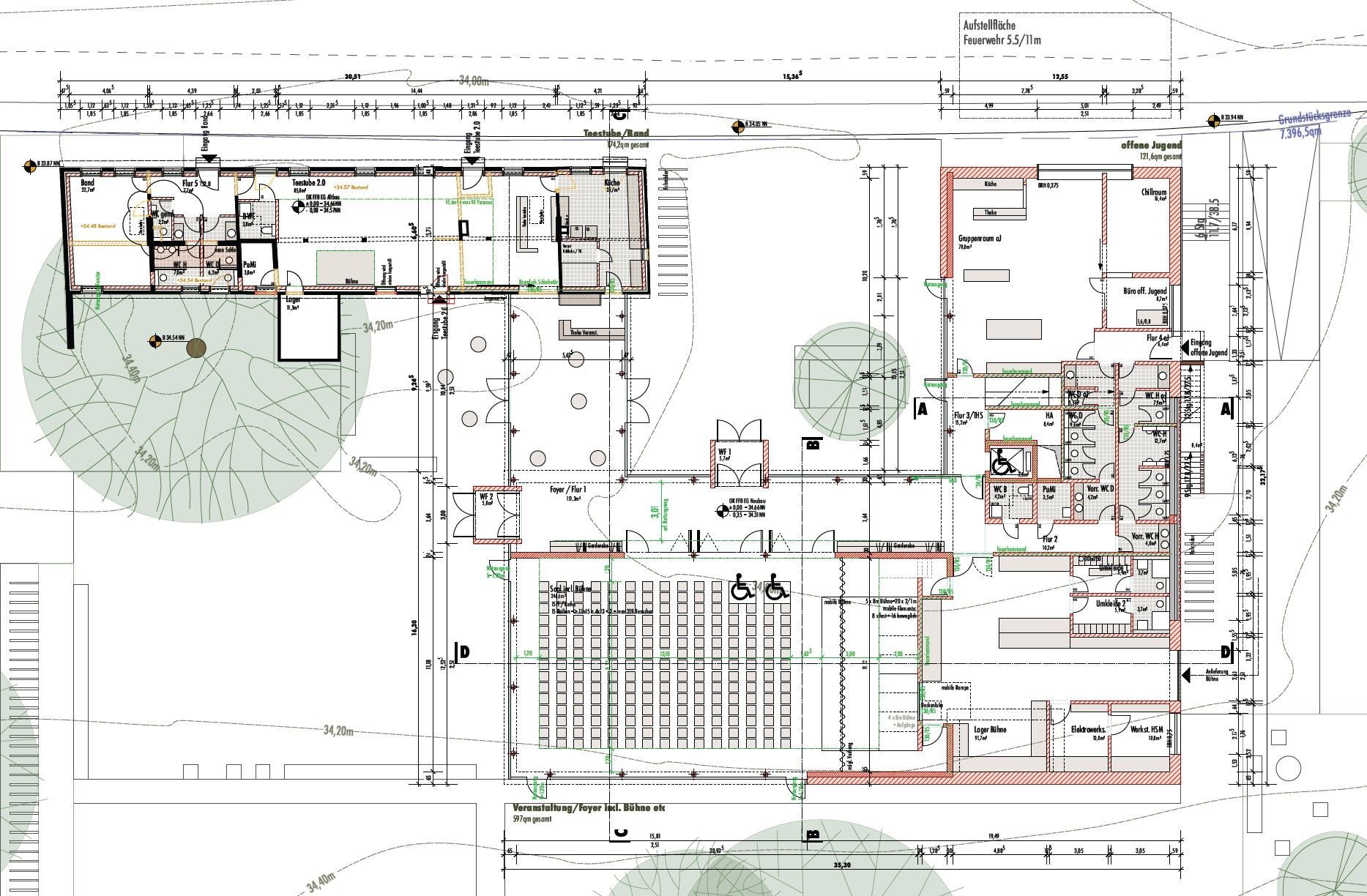 Auf der gegenüberliegenden Seite befindet sich ein großzügiges Foyer mit überdachtem Eingangsbereich, Küche, Garderobe und WC-Anlagen für die Nutzung des Gebäudes als Dorfgemeinschaftshaus und Versammlungs- und Veranstaltungsstätte.